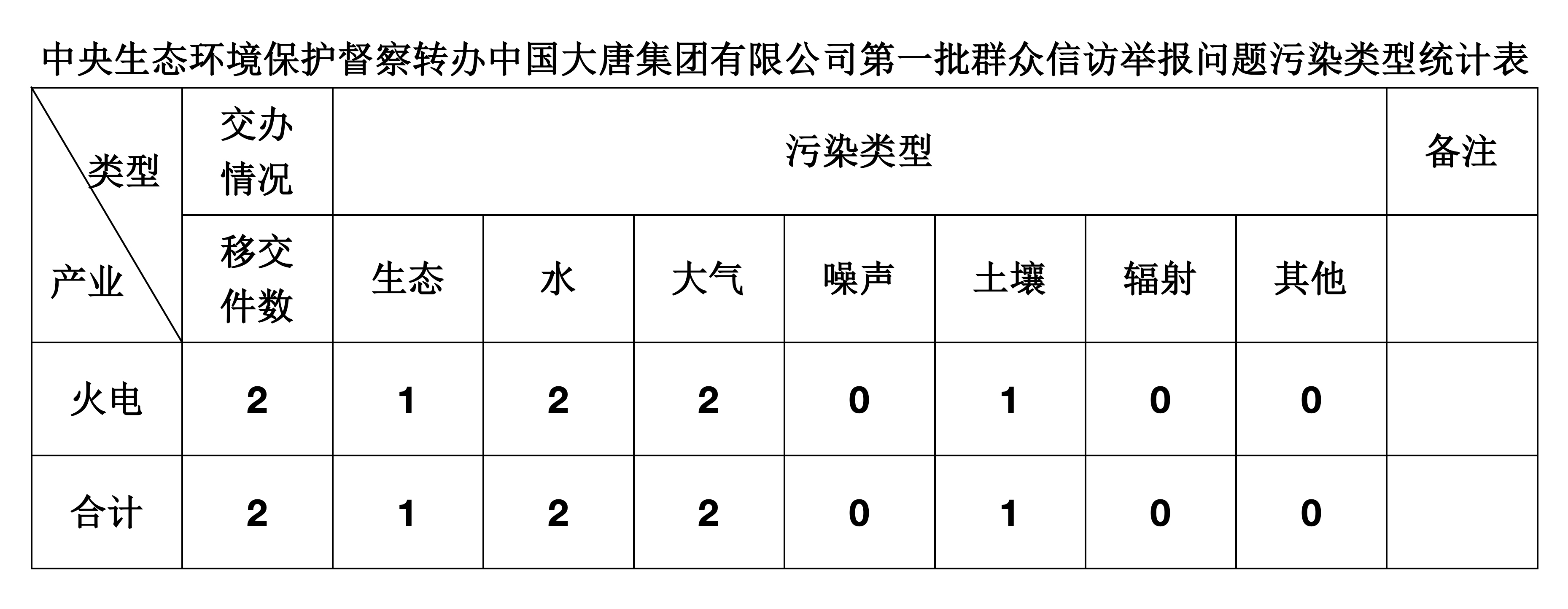 2025年5月30日,中央第七生態(tài)環(huán)境保護(hù)督察組向中國(guó)大唐集團(tuán)有限公司移交第一批群眾信訪舉報(bào)件,共計(jì)2件,均為來(lái)電舉報(bào)件,涉及生態(tài)問(wèn)題1個(gè)、水問(wèn)題2個(gè)、大氣問(wèn)題2個(gè)、土壤問(wèn)題1個(gè)。所有舉報(bào)件辦理工作已第一時(shí)間進(jìn)入調(diào)查核實(shí)辦理程序,辦理情況將按照相關(guān)要求反饋督察組,并及時(shí)向社會(huì)公開。