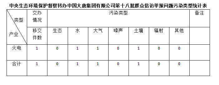 2025年6月27日,中央第七生態(tài)環(huán)境保護(hù)督察組向中國大唐集團(tuán)有限公司移交第十八批群眾信訪舉報件,共計1件,為來電舉報,涉及水問題1個、大氣問題1個、土壤問題1個。所有舉報件辦理工作已第一時間進(jìn)入調(diào)查核實辦理程序,辦理情況將按照相關(guān)要求反饋督察組,并及時向社會公開。